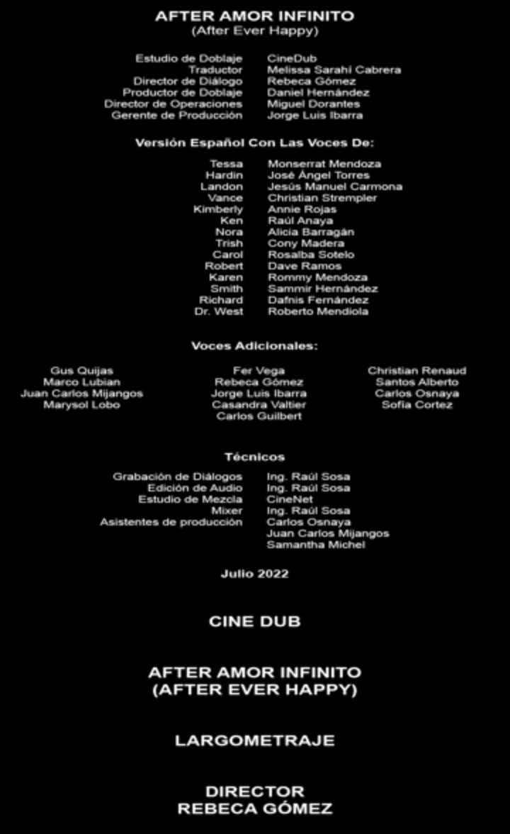 After: Amor infinito es una película de 2022 basada en la novela de Anna Todd, dirigida por Castille Landon y protagonizada por Josephine Langford y Hero Fiennes-Tiffin.