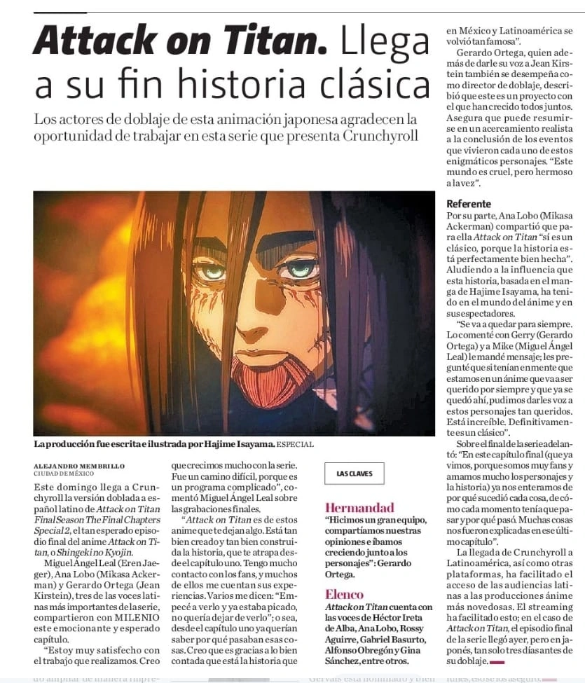 Reportaje en el diario MILENIO de México que habla del final del anime y con entrevistas al director y reparto de la serie.