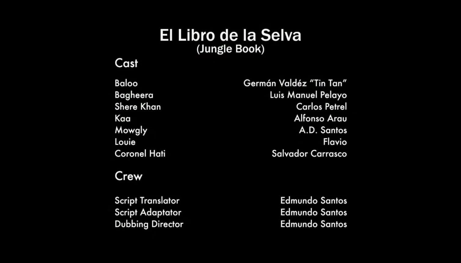 - Interpretado por: Germán Valdés "Tin Tan" (Baloo), Diana Santos (Mowgli) y Luis Manuel Pelayo (Bagheera).