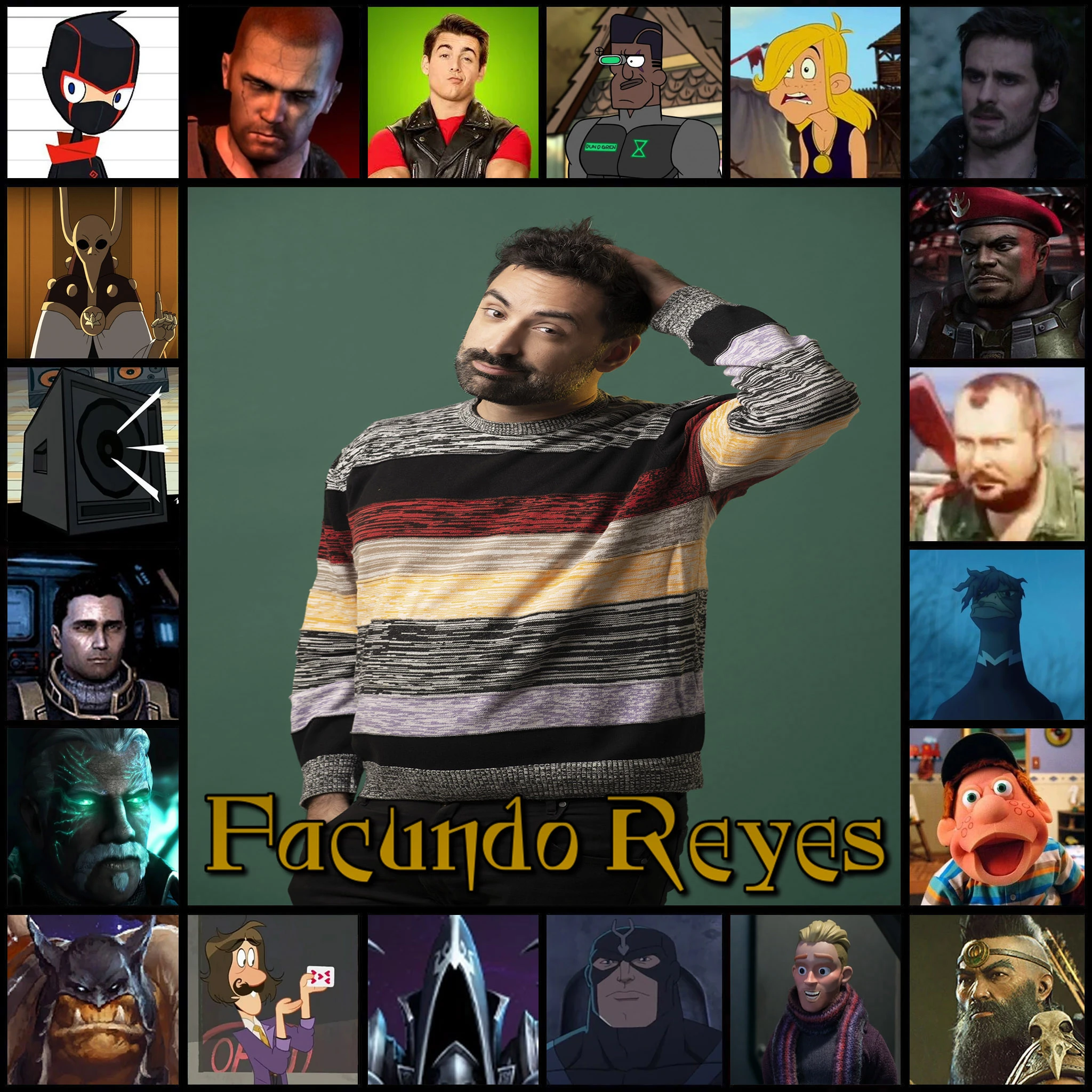 Randy Cunningham / El Ninja en Randy Cunningham: Ninja total. Emperador Belos en La casa búho. Irving el Ilusionista en El fantasma y Molly McGee. Justforkix en Astérix y los vikingos. Dungren en Gravity Falls: Un verano de misterios (temp. 2). Caricaturista / Zombie en Bad Cat. Capitán Killian "Garfío" Jones Espectro en Once Upon a Time. Butchy en Teen Beach Movie y Teen Beach 2. Bruno en ¡Qué talento!. Julio en Cocorico (doblaje de Paka Paka). Caballero Araña en Ultimate Spider-Man. Austin Van Der Sleet en M.O.D.O.K. Takanohashi (1ª voz) en Btooom!. Presentador en Hi-Fi Rush. Roberto Guerro en Uncharted 3: Drake's Deception. Subo en Diablo IV: Vessel of Hatred. Malthael en Heroes of the Storm y Diablo III. Rexxar también en Heroes of the Storm. Emil Narud (forma real) en StarCraft II. Matthew "Matt" Horner (2da voz) en StarCraft II. Samir Duran en StarCraft: Remastered. Errante en Lifi: una gallina tocada del ala. |