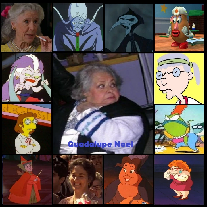 Tía Sara en La dama y el vagabundo (redoblaje) y La dama y el vagabundo II: Las aventuras de Scamp. Zirconia en Sailor Moon SuperS. Bunny McDougal en Sexo en la ciudad. Shin "Oshin" Tanokura (anciana) en la recordada telenovela japonesa Oshin. Machiko Godai (Machiko Yashiro) en Las invencibles. Abuela Minka (1ª voz) en Aventuras en pañales. Maestra Mollerín en Las nuevas aventuras de Doug. La Bruja Aburrida en Las tres mellizas. Rossie Jensen en la saga de películas de Mira quién habla. Stella Baines en Volver al futuro (doblaje mexicano). Harriet Walsh en Los Goonies. Madre Superiora en Mi pobre diablillo. Cleo "Ninny" Threadgoode en Tomates verdes fritos. Mary Luckett en Cocoon. Clairee Belcher en Magnolias de acero. Carmella Corleone en las películas de El Padrino. Lady Simone Lytton en La pista de la Pantera Rosa y La maldición de la Pantera Rosa. Myra Breckinridge en Myra Breckinridge. Maestra Elizabeth Stricter en Los Simpson (temps. 3-8). Agnes Skinner (1ª voz) también en Los Simpson. Alcmena en Hércules. Átropos también en Hércules. Luna en Thundercats, los felinos cósmicos. Mahra en El librito de la selva. Hedwig, la bruja del mar en Aventuras de la pequeña sirenita por Saban. Barsa en Kiki: Entregas a domicilio (doblaje original). Obaba en Guerreros del viento (doblaje mexicano). Fuji Mine en Yaiba. Entrenadora Puercoespín en Franklin (temps. 1-5). Sarah Packard en El Audaz. Claire Hewitt en Almas en conflicto. Valerie en La princesa prometida (doblaje mexicano). Mortianna en Robin Hood: Príncipe de los ladrones. Sra. Hess en Mi pobre angelito 3. Rebecca Nurse en Las brujas de Salem. Señora con gatos en Jeepers Creepers (Doblaje de MGM). Sra. Busotsky en El club de los monstruos. Alice en Los imperdonables. Sra. Sellner en Papá por siempre. Irma Bunt en 007: Al servicio secreto de Su Majestad. Sra. Firth en Tres vidas errantes. Sarah Lee Gates en Hawái azul. Inez Quintero en La marca del Zorro. Helena Glabro en Espartaco (doblaje original). Gail Wallens en Duro de matar. Madre de Idasa e Ikoze en Dragon Ball Z. Directora del orfanato (1ª voz, eps. 1 y 2) en Nadja del mañana. Sra. Flagmenkoff en Anastasia. Abuelita en Tom y Jerry: Rápidos y Furiosos. Leola en Las aventuras de Pulgarcito y Pulgarcita. Sra. Kwan en El gato. Abuela Georgina en Charlie y la fábrica de chocolate. Guadalupe dobló a la actriz Olympia Dukakis en varias de sus películas. |
