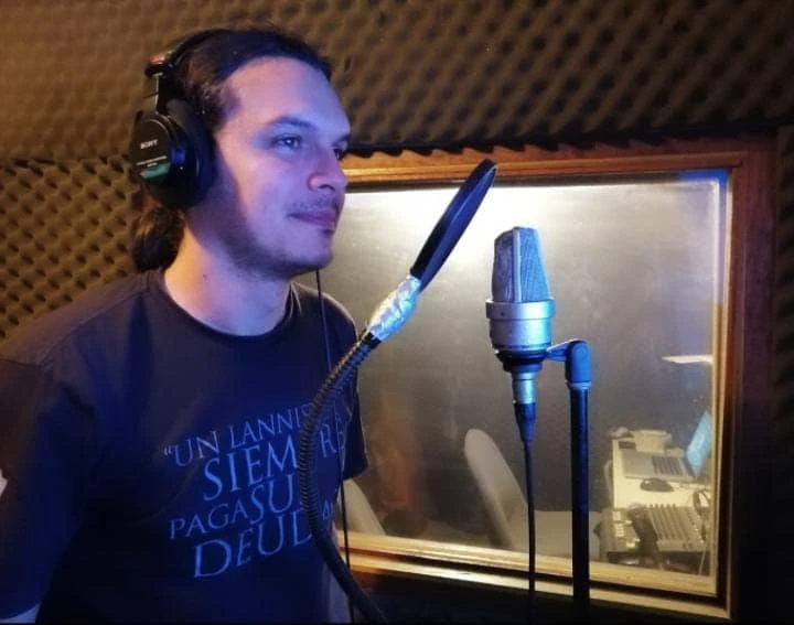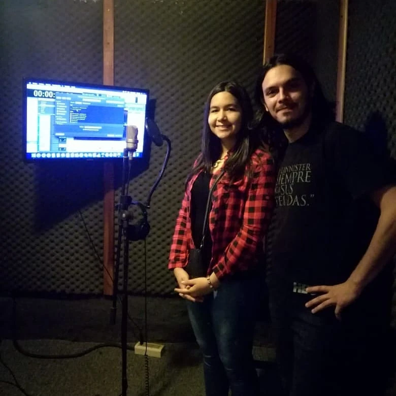 El actor y docente Levy Hurtado y la ganadora y actual profesional del medio Cecilia Acosta, cuando resultó ganadora de la media beca otorgada por Fuera de Axis - Dubbing el 22 de septiembre de 2019, en el estudio de Houston Producciones.