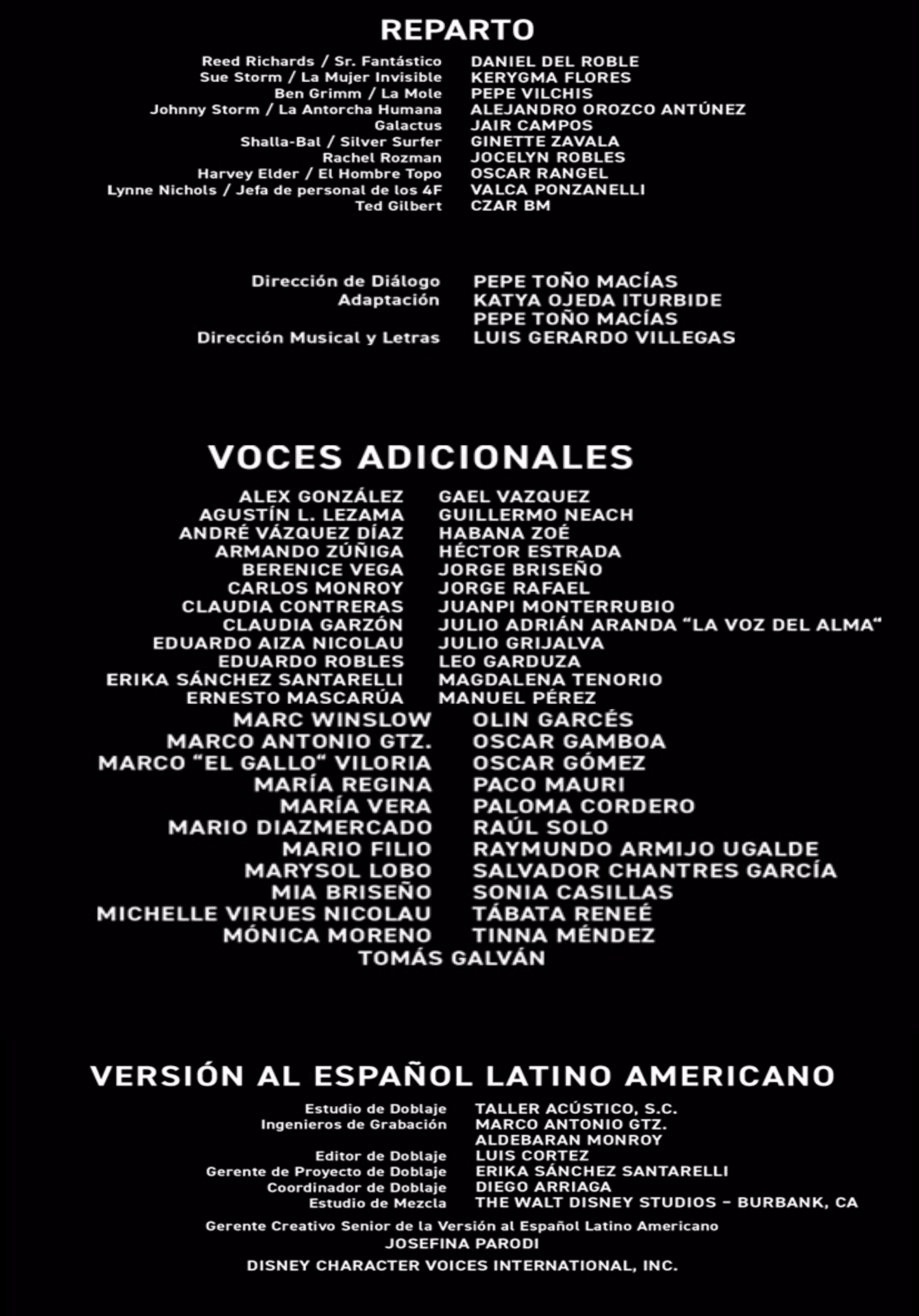 - Daniel del Roble, quien ha participado en la franquicia haciendo personajes destacados como Frank Castle / The Punisher, Uatu / El Vigilante, Jasper Sitwell, Zeus y varios más, da voz a Reed Richards / Señor Fantástico en este proyecto, siendo la primera vez que hace un personaje estelar en una de las películas.