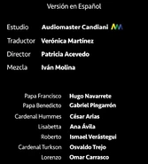 - En la versión original, las líneas en español de Jonathan Pryce fueron dobladas por Juan Minujín, quien también interpreta al Papa Francisco de joven. [1] En el doblaje, sin embargo, es doblado enteramente por Hugo Navarrete.