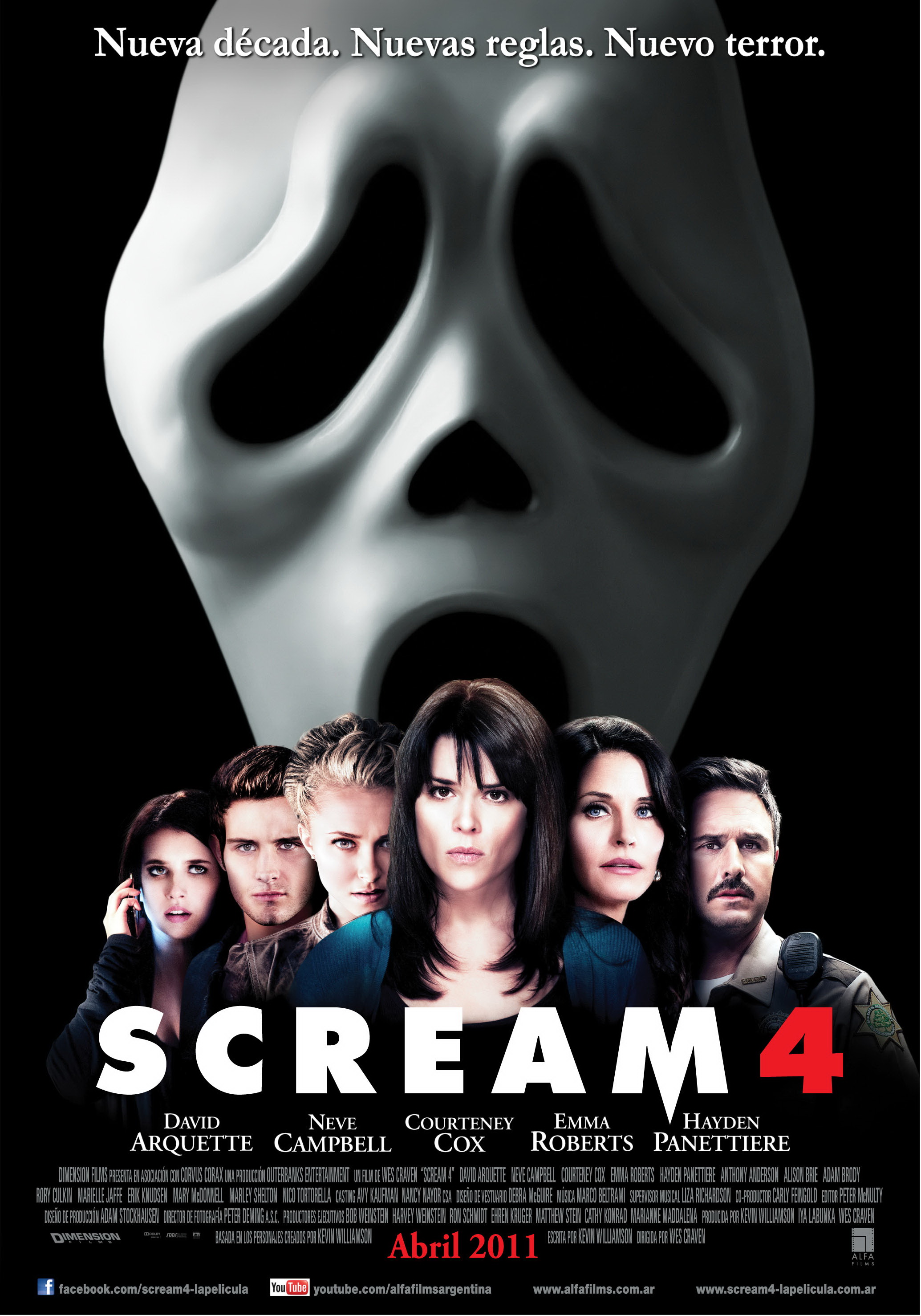 Scream 4: Grita de nuevo es una película de terror y la cuarta parte de la famosa franquicia del mismo nombre, estrenada el 15 de abril de 2011. Dirigida por Wes Craven, escrita por Kevin Williamson y protagonizada por Neve Campbell, David Arquette y Courteney Cox.