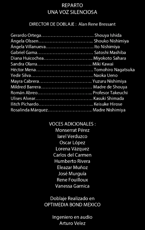 Una voz silenciosa es una película de animación japonesa, Producida Por Kyoto Animation, dirigida por Naoko Yamada (K-ON!, Tamako Market) y basada en el manga escrito y dibujado por Yoshitoki Oima. Fue estrenada en México por KEM Media el 5 de mayo de 2017.
